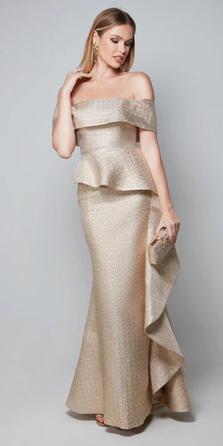 Gold Off the Shoulder Jacquard Long Gown with Ruffle