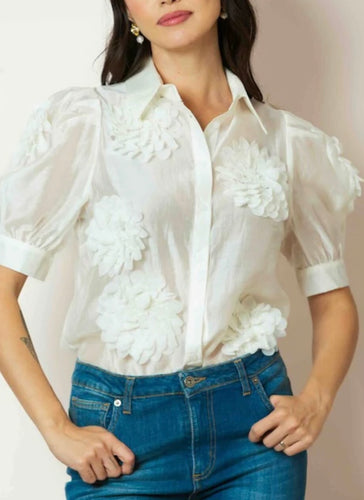 Jessie Liu Ivory Button Down Shirt with Flower Applique