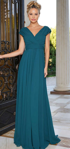 Chiffon Long Gown with Ruching and A-Line Skirt with Cap Sleeve