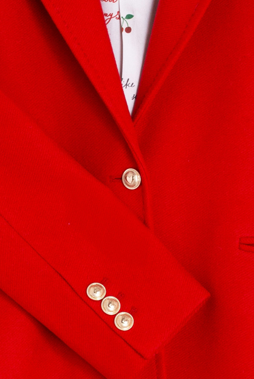 This is a classic! Wear this top coat with jeans, trousers or a fabulous dress. It is the perfect red with stunning buttons.