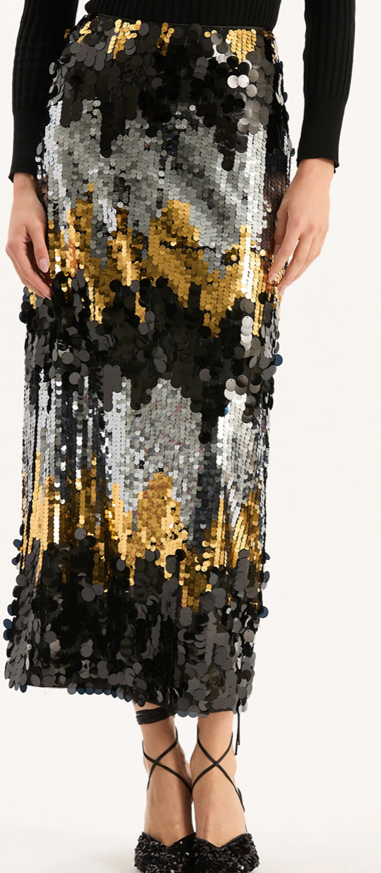 Sparkle and shine this season in the Collins Paillettes Skirt — a dazzling statement piece featuring bold sequins in a stunning ombré blend of gold, silver and black, creating a striking visual effect with every movement. The Collins offers a sleek, straight silhouette that flatters the figure while allowing fluid motion. The subtle shimmer and sophisticated pattern make it the perfect choice for festive soirées, galas, or nights out.