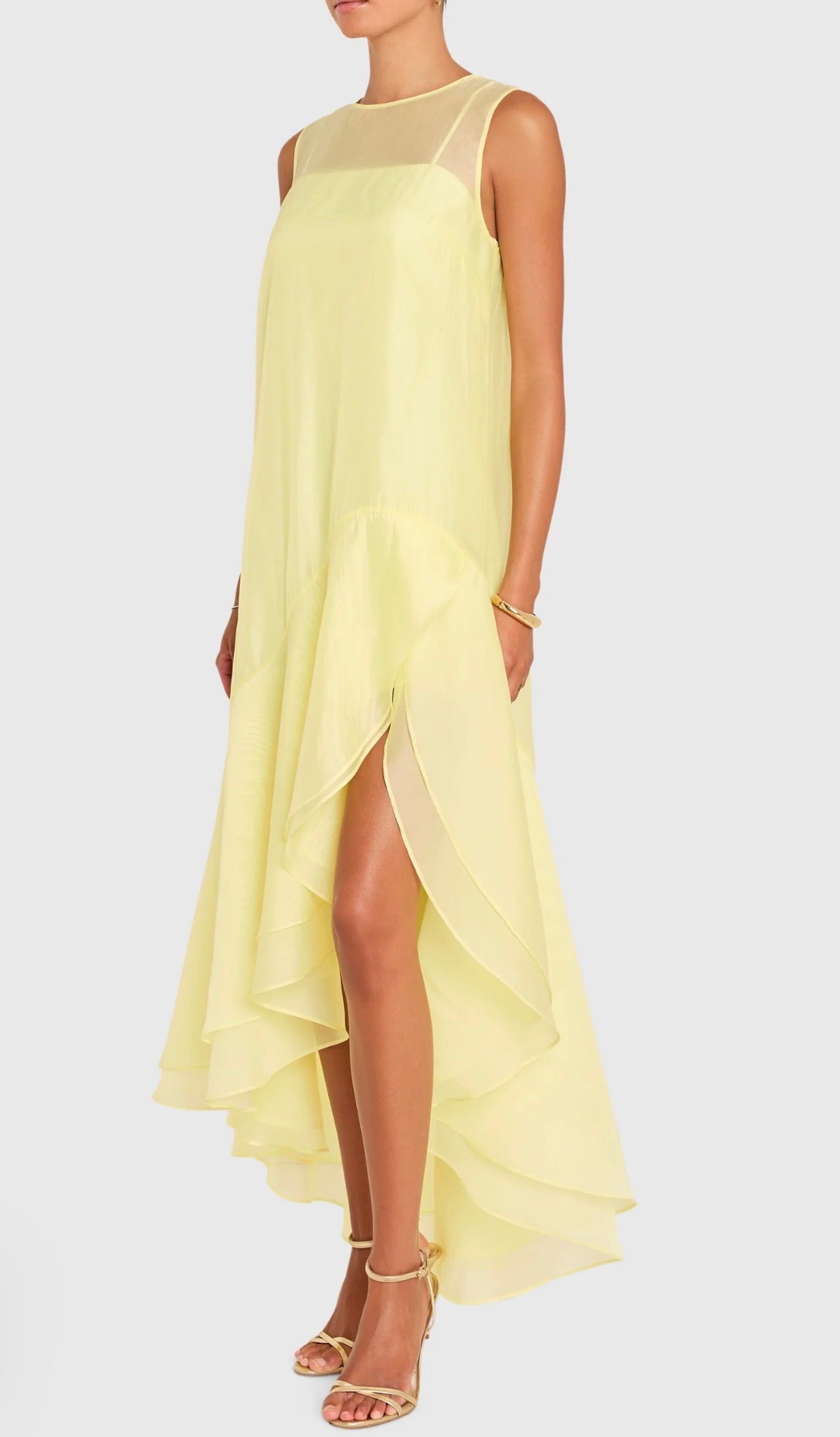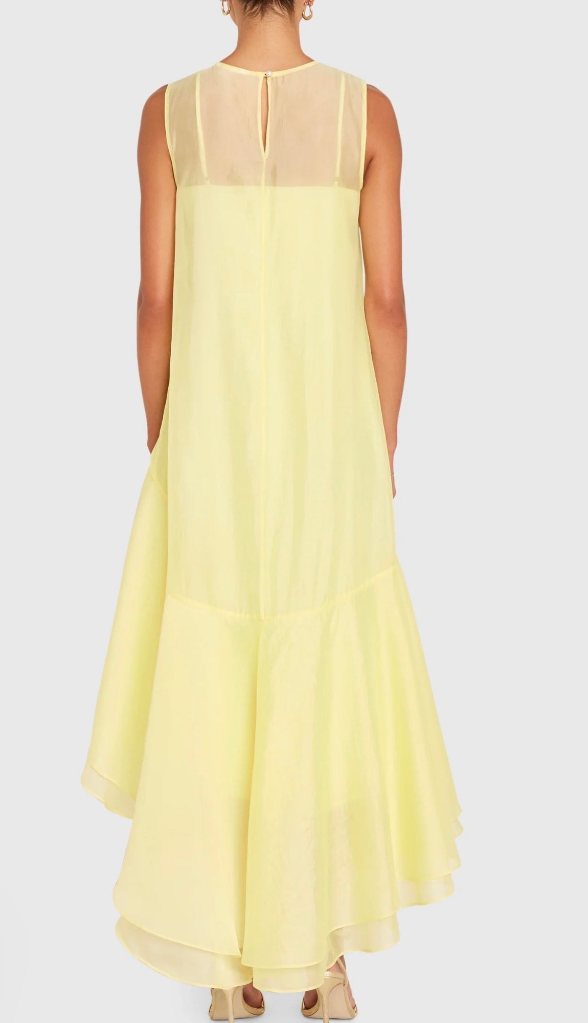 Gorgeous butter yellow lightweight maxi dress that can take you anywhere. Pretty sheer neckline with layered ruffled skirt.