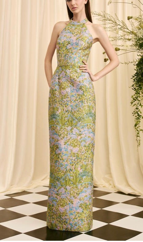 Stunning halter jacquard column gown in a couture print. Perfect for your special occasion where a floral is just what you’re looking for.
