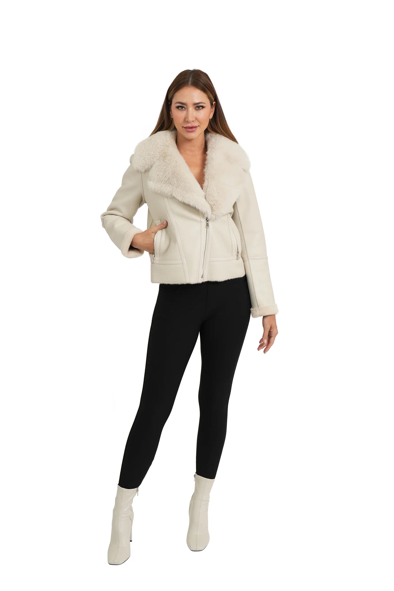 Alana faux fur moto jacket, faux leather shell, notched lapel collar, front zip closures, front zip pockets, relaxed fit.