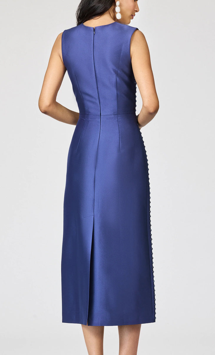 The Alba Dress in Washed Indigo is the essence of modern minimalism with an elegant twist. Cut in a sleek, tailored silhouette, it skims the body with quiet confidence for a flawless, figure-defining fit. The clean scoop neckline frames the collarbone beautifully, while the sides are traced with dyed-to-match faceted crystal embellishment for a subtle touch of artisanal sparkle. Understated yet striking, Alba is designed for evenings that call for refined sophistication and timeless appeal.